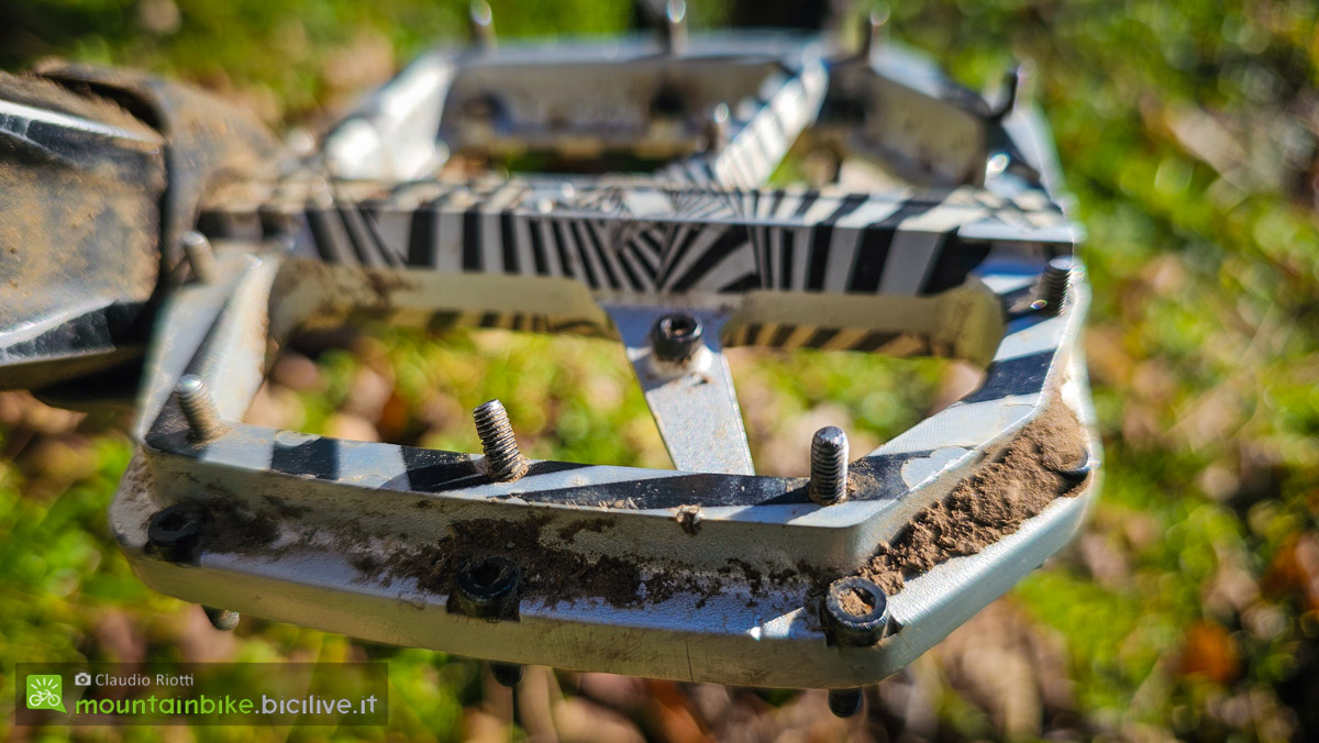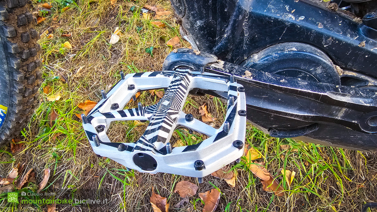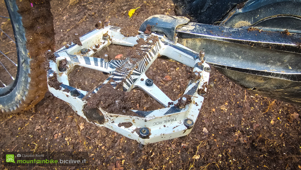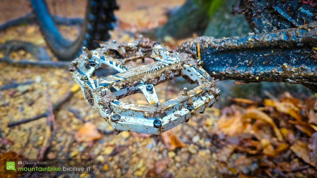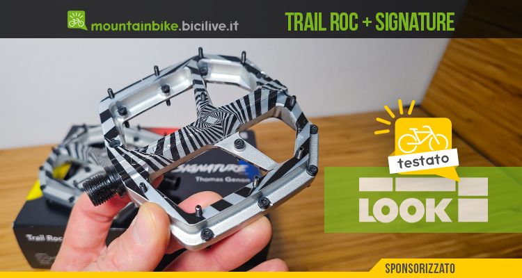 Test pedali LOOK Trail Roc+ Signature Series Thomas Genon Claudio Riotti 17 Febbraio 2025 Test Abbiamo messo alla prova il pedale Trail Roc + di LOOK Cycle (www.lookcycle.com) nella versione “Thomas Genon Signature”, disponibile sul sito ufficiale al prezzo di 179,90 euro. Questo pedale sviluppato in collaborazione con il rider Thomas Genon si presenta come una soluzione flat con 10 pin studiata appositamente per le discipline DH, dirt e trail. Se cerchi un pedale con il super grip, leggi il “test dei pedali MTB flat Base Pedals di e*thirteen: grip altissimo, prezzo basso“. Il prodotto nasce dalla volontà di offrire ai rider una piattaforma ampia e durevole, capace di garantire il massimo controllo e stabilità anche in condizioni estreme. Thomas, conosciuto anche come “Tommy G”, è un rider belga famoso per il suo talento eccezionale nel freeride e nello slopestyle MTB che vanta, tra le altre cose, ben 10 partecipazioni alla Red Bull Rampage. Il design del pedale è ispirato ad alcuni dei suoi film preferiti di Hitchcock e Kubrick, con una grafica psichedelica che come dice lui stesso “riflette davvero la mia personalità”. LOOK, con la sua serie Signature, ha già reso omaggio a icone come Peter Sagan, Alberto Contador e Christoph Sauser, impronte indelebili nella storia del ciclismo. La nuova edizione si dedica invece a due rider d’eccellenza, Kriss Kyle e Thomas Genon, protagonisti nelle rispettive discipline. Abbiamo già parlato dei Trail Roc+ nella nostra Guida alla scelta pedali MTB a sgancio e flat LOOK. La versione normale è disponibile in tre colori Orange, Black e Silver al prezzo di 159,90 euro. Trail Roc+ Thomas Genon, caratteristiche tecniche Corpo: in alluminio forgiato Asse: in acciaio Chromoly+ Due cuscinetti a sfera 10 pin a vite regolabili e sostituibili Dimensioni: 104 mm x101 mm x 16 mm Q Factor: 56 mm Peso rilevato: 197 g l’uno, 395 g il paio Prezzo: 179,90 euro Nemmeno la peggiore giornata di pioggia ci ha fermato per questo test… Il nostro test Come scritto nella nostra guida per scegliere i pedali flat o a sgancio, reputo che sia sempre meglio usare entrambi così da non prendere nessun “vizio di forma” e trarre il meglio dalle due tipologie di guida. In inverno uso spesso i flat, sia in pumptrack che in enduro, proprio per “risvegliare le caviglie” e mantenere la giusta sensibilità sui piedi, cosa che con i pedali clipless (ovvero a sgancio) si tende a perdere. Ho quindi montato i Trail Roc + sia sulla mia e-MTB Moustache Trail 9 che sulla bici da dirt e li ho provati con diverse scarpe per valutarne il grip. L’esploso dei Trail Roc permette di vedere i due cuscinetti a sfera. Sono passato da delle FiveTen Freerider Pro a delle Leatt con suola Vibram XR Ride, delle vecchie FiveTen Impact con suola un po’ consumata, delle Shimano GR7 e infine le nuove scarpe di Dainese HG ACTO PRO sempre con suola Vibram, così da avere più feedback possibili. Le uscite sono state sia in condizioni di pioggia e fango estremo sia di bel tempo, su svariate tipologie di terreni e di trail. I pin molto lunghi aiutano anche in caso di fango compatto che si accumula sul pedale: il grip resta buono. Sul campo Si tratta di un pedale con piattaforma di dimensioni ottimali per la maggioranza dei rider maschi. Porto un 43,5 e ogni scarpa che ho usato ha trovato spazio su tutti e 10 i pin disponibili. La prima sensazione quando si posiziona il piede è la minima distanza del pedale dalla pedivella. Se da un lato questo potrebbe migliorare la pedalata grazie a un fattore Q ridotto, può anche risultare scomodo: se si appoggia il piede in fretta, alla prima pedalata si rischia di avvertire un’interferenza della scarpa con la pedivella. Per evitarlo, bisogna fare più attenzione nel posizionare i piedi. Abbastanza fastidiosa come cosa. La seconda caratteristica è il corpo del pedale, estremamente piatto ma con una leggera sporgenza centrale in corrispondenza dell’asse. Visto di profilo infatti rivela una superficie convessa anziché concava. I lunghi pin posizionati strategicamente compensano in parte questo strano design, garantendo un grip abbastanza soddisfacente in ogni situazione. I pin sono “estremi”, circa 5 mm, e sottili: anche se consumano prima le suole, generano un buona aderenza con praticamente tutti i disegni e tassellature in commercio. Attenzione agli stichi però! Tutti e dieci i pin su entrambe le facce del pedale sono costituiti da viti con testa “torx”: questo li rende facilmente sostituibili anche con viti normali a testa esagonale ed è un bene perché durante il test ne abbiamo piegati parecchi a causa di collisioni con rocce e radici sui trail. Si raddrizzano facilmente ma a lungo andare è facile che si spezzino. I pin lunghi si piegano facilmente, anche perché quando si pedala sono più vicini al terreno (nella faccia inferiore del pedale). Conclusioni I pedali LOOK Trail Roc + si sono rivelati un prodotto ben fatto e “stiloso” per chi cerchi una piattaforma ampia e piatta, che fornisce buone prestazioni in ambito dirt, pumptrack e salti ma non garantisce il top del grip data la forma convessa del pedale. Nell’utilizzo enduro infatti è importante abbinarli a una buona scarpa con suola molto morbida, e anche così comunque il grip non è da “primi della classe”. I pin molto lunghi sono un arma a doppio taglio (a tutti gli effetti): forniscono grip ma sono facilmente danneggiabili e le suole delle scarpe, a lungo andare, ne risentono. Inoltre si urta più facilmente il terreno con la faccia inferiore del pedale e spesso si piegano i pin proprio per questo. Il prezzo della versione “signature” è davvero molto alto, 179,90 euro, ma in gamma si trovano anche modelli più abbordabili. Per ulteriori informazioni sui pedali Trail Roc + e sugli altri prodotti targati LOOK vi invitiamo a consultare il sito web ufficiale del brand francese. Qui invece trovate altri articoli che parlano di LOOK: Guida alla scelta
