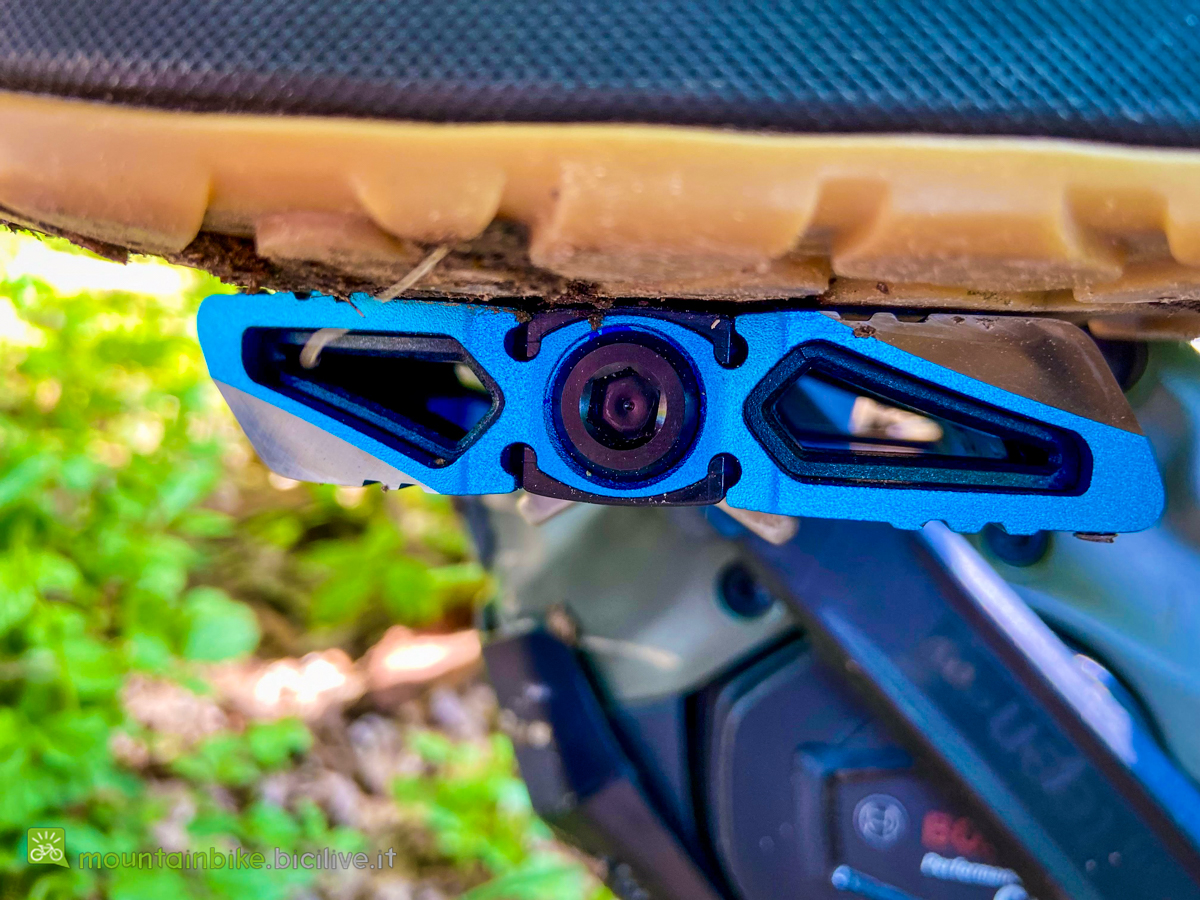 Lo scasso per le tacchette da 35 mm di lunghezza consente un’ampia escursione posteriore per chi desidera una posizione più arretrata del piede — una scelta che molti rider enduro apprezzano per migliorare il controllo nelle sezioni tecniche in discesa.