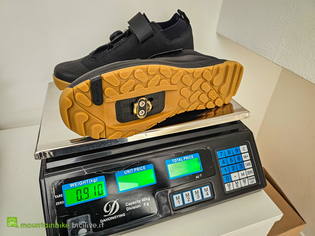 Il peso rilevato sulla nostra bilancia con le tacchette Crankbrothers montate (30 grammi il paio), quindi il peso reale è di 880 grammi, circa 440 grammi a scarpa.