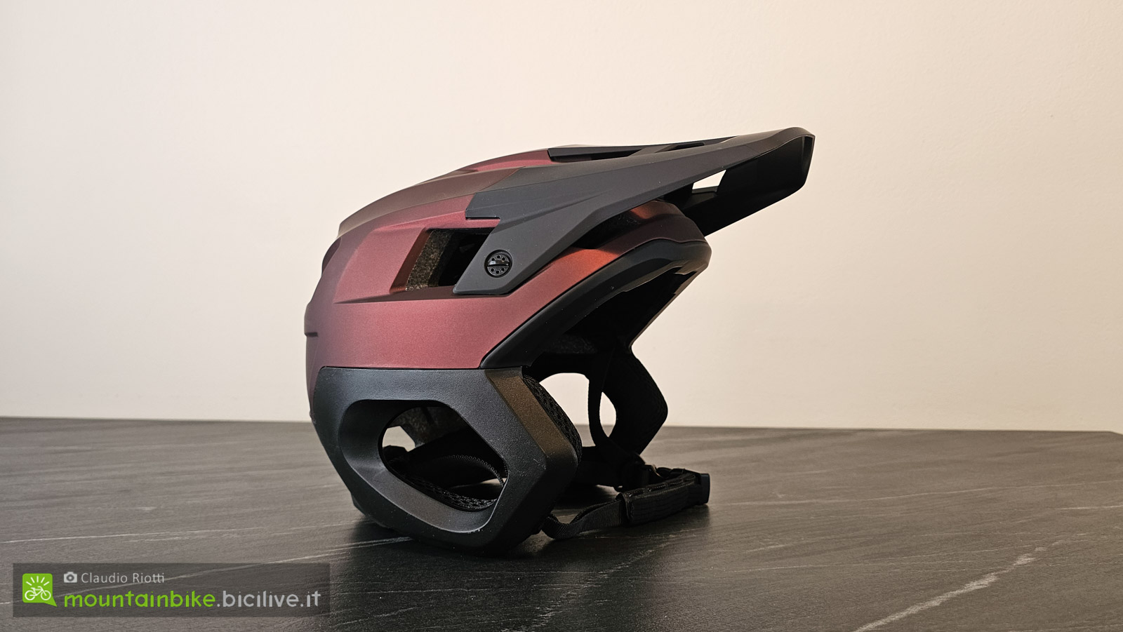 La parte posteriore del casco presenta uno scasso per ospitare la fascia elastica della maschera che nell’uso resta così stabile anche senza dover stringere troppo il suo elastico.