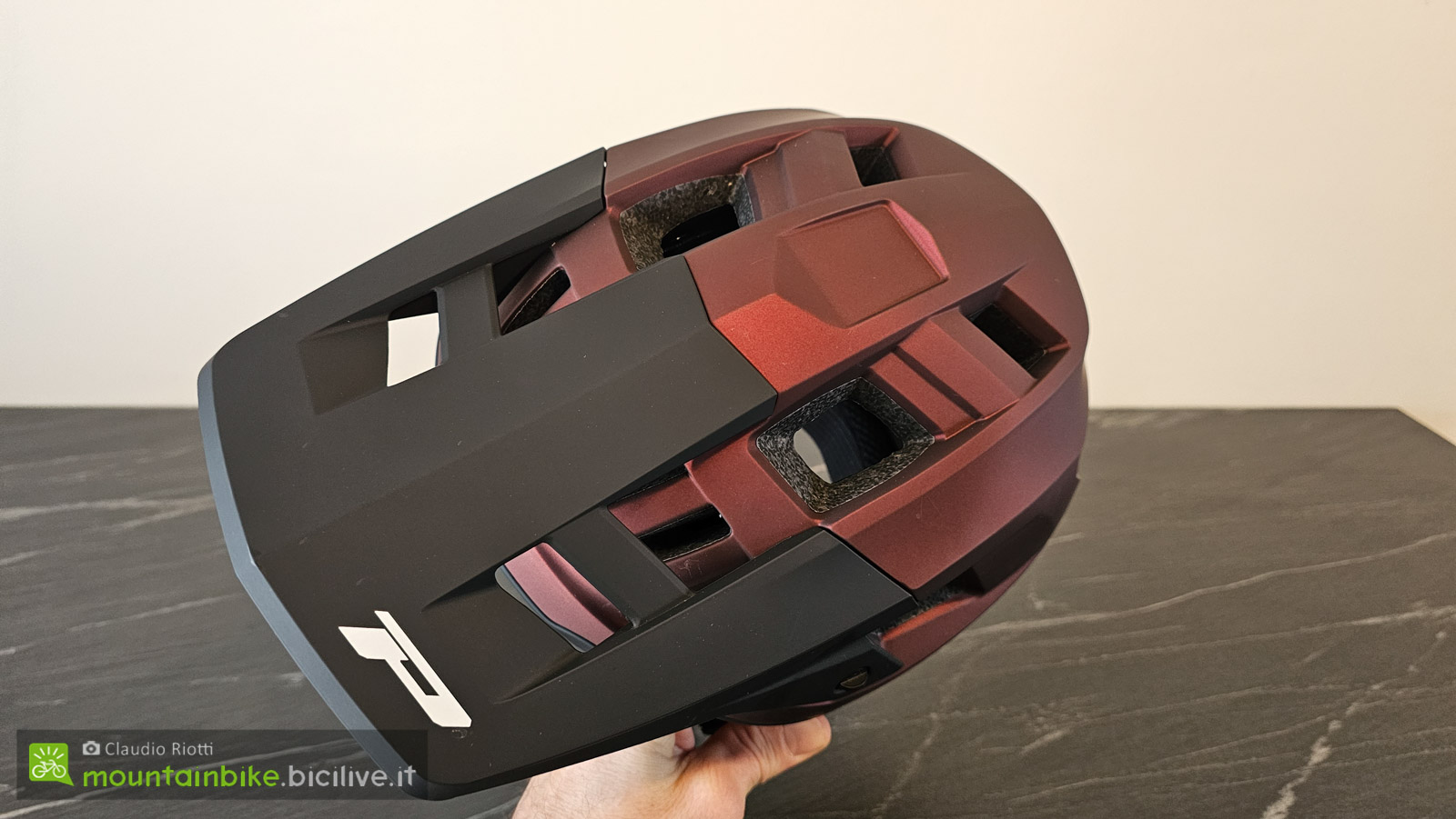 L’aletta si integra perfettamente con la calotta. Da notare lo scasso per installare l’adesivo per action cam o luce sopra al casco.