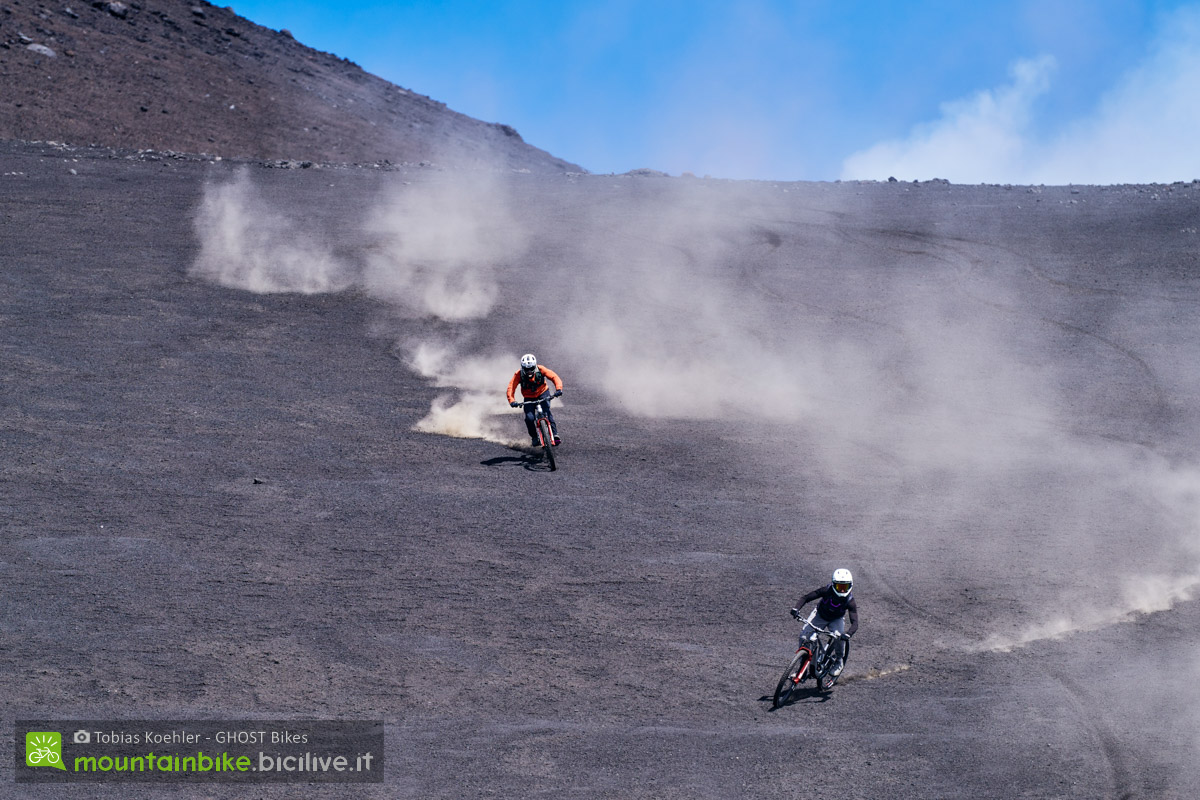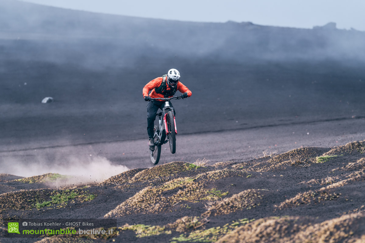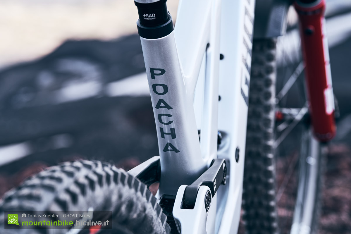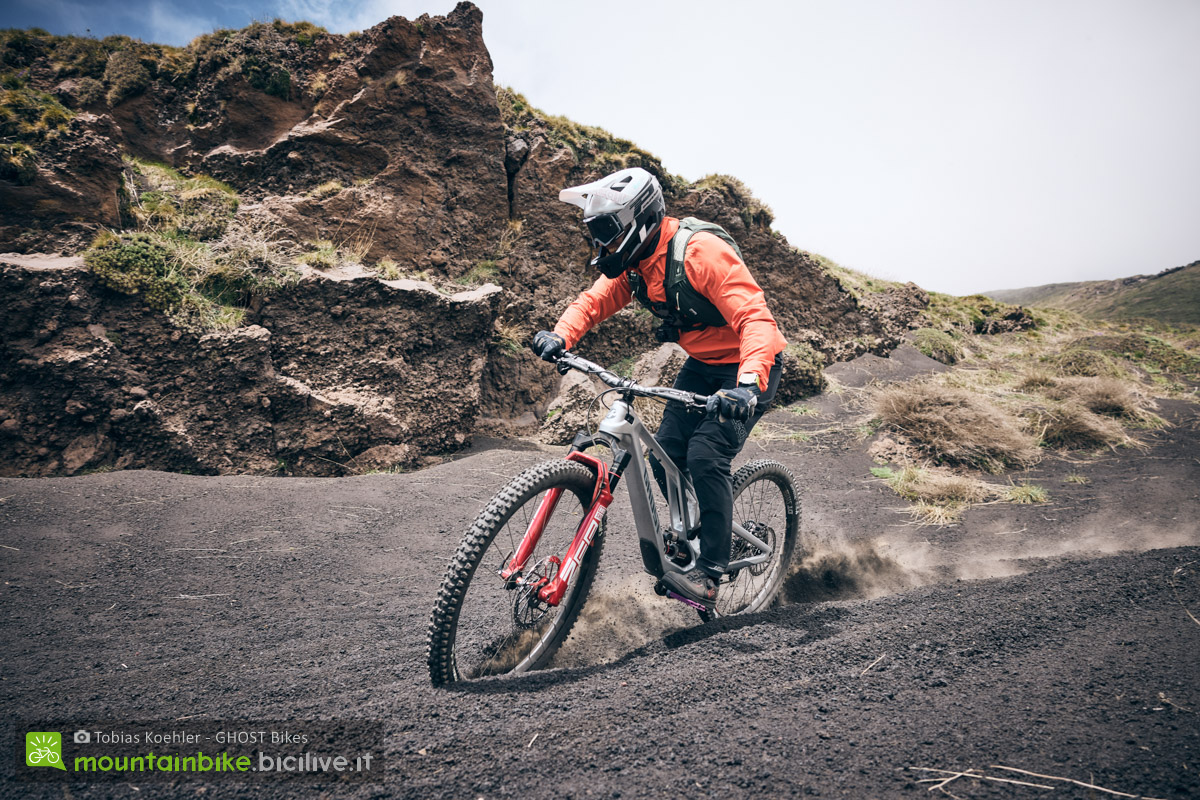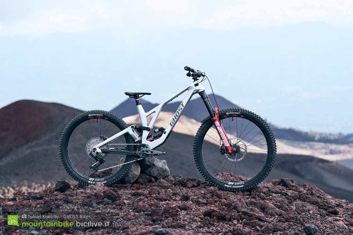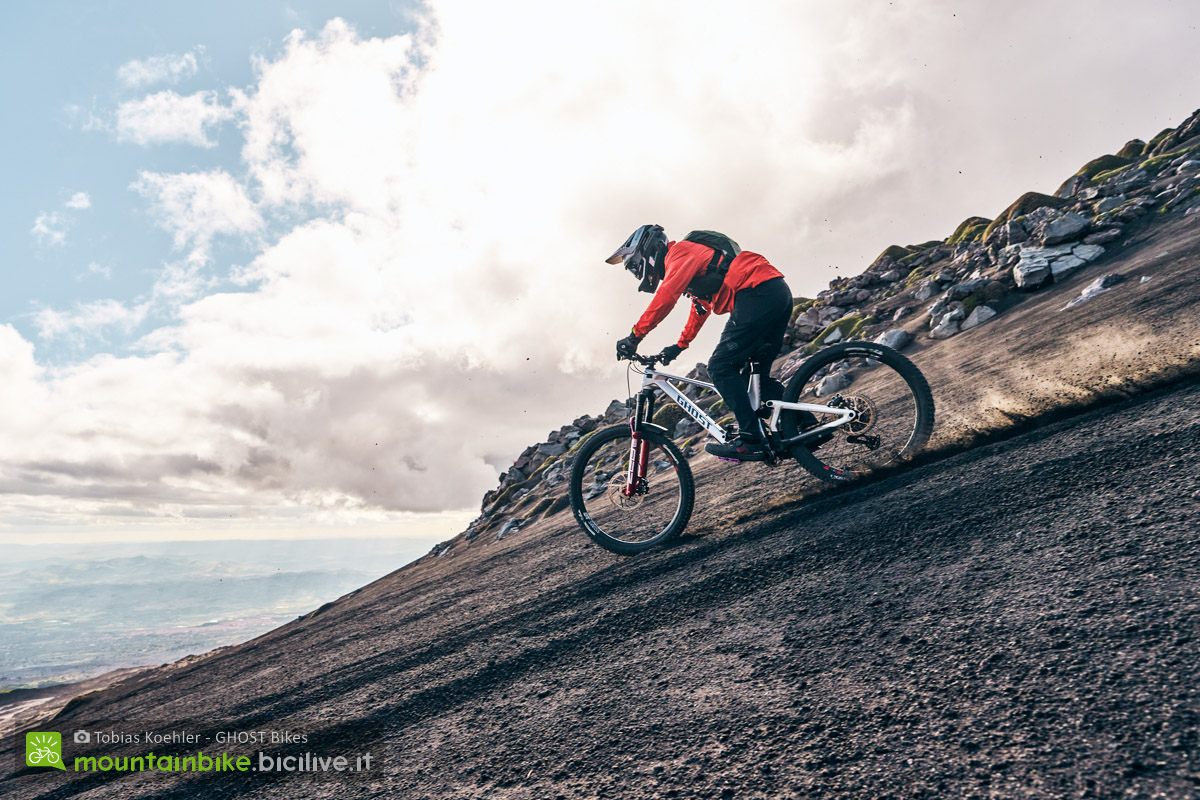 Test GHOST POACHA: una MTB da freeride provata sul vulcano Etna Claudio Riotti 7 Maggio 2025 Test Siamo stati invitati da GHOST Bikes come unico media italiano per trascorrere una due giorni indimenticabile sul vulcano Etna, in Sicilia, per la presentazione della nuova MTB da freeride POACHA. Questa mountainbike è frutto di due anni di sviluppo e presenta una geometria modificabile, 180 mm di escursione su ruote mullet 29/27.5, telaio in carbonio e carro VPP con tecnologia Traction Link 3.0. Tre modelli in gamma con prezz do 8.000 euro di per la POACHA FULL PARTY, 6.499 euro per la POACHA PRO e 4.999 euro per la POACHA modello base. Vediamo ora alcuni dettagli, le caratteristiche tecniche e il montaggio del modello provato. Alla fine dell’articolo trovate le nostre impressioni ma si tratta di un breve test di due giorni e non di una prova a lungo termine come facciamo di solito. GHOST POACHA, un nome da spiegare GHOST Bikes è famosa per i nomi particolari delle sue biciclette come LECTOR, NIRVANA, RIOT, PATH RIOT tutti concepiti per dare un’idea del carattere della bici. Il nome scelto per questa nuova mountain bike deriva da “poacher”, il cacciatore di frodo, ma è cambiato con la “a” finale per trasformarlo in un nome con un’accezione positiva. Per GHOST infatti, POACHA è il termine adatto per definire quei rider che non seguono la linea più facile per scendere ma ne creano una loro, nella vera filosofia del freeride, ed è proprio quello che abbiamo fatto sui pendii di sabbia vulcanica dell’Etna! Korbinian Engstler (casco giallo) e Tomáš Slavík (casco Redbull). Un progetto ampio per una MTB molto versatile La POACHA rappresenta una ventata di aria fresca per il brand tedesco. Difatti, per consolidare il nuovo posizionamento del marchio, GHOST supporta come sponsor The Nines, uno dei più importanti festival europei di Freeride e Slopestyle in mountain bike. Inoltre, per il lancio di questa nuova MTB c’è un grande progetto globale che ha previsto anche la realizzazione di un video, il POACHA’s journal, che è un cortometraggio girato con i pro rider GHOST che sono intervenuti nello sviluppo, Tomáš Slavík e Korbinian Engstler, più altri due nuovi rider fortissimi nei trick in stile slopestyle. Il video è stato realizzato in Europa e Canada ed è veramente molto bello, lo trovate a questo link. Slavík (ormai leggenda della MTB, tre volte campione del mondo 4X, atleta RedBull e vincitore di svariate Urban Downhill “Cerro Abajo”) ci ha svelato che userà la POACHA per le sue competizioni di downhill urbano con l’ammortizzatore bloccabile via wireless al manubrio per le sezioni pedalate e le forti compressioni dei salti a “hip”. La POACHA però è pensata anche per il downhill puro perché si può montare con una forcella doppiapiastra da 200 mm, aumentando l’escursione posteriore a 190 mm cambiando interasse dell’ammortizzatore (75 mm anziché 70 mm). Oppure è utilizzabile anche per l’enduro spinto, dato che si può pedalare in vetta abbastanza agilmente per essere una “biciona” con 180 mm di escursione, come abbiamo avuto modo di provare nei (seppur brevi) trasferimenti di questa due giorni grazie al setting “High” con cui GHOST ci ha fornito le bici, ne parliamo nel paragrafo seguente. Caratteristiche tecniche La POACHA è quindi una MTB davvero solida e creata per “lo scassato”, il claim che GHOST ha scelto, built for the rough, è decisamente azzeccato. Il telaio in carbonio pesa 3,8 kg in taglia L ed è testato per ottenere la classificazione di “categoria 5” (la classificazione ASTM, American Society for Testing and Materials, suddivide le MTB in diverse categorie in base al loro utilizzo e alle condizioni di carico che possono sopportare. La categoria 5 è la più resistente e si rivolge a biciclette destinate a percorsi estremamente impegnativi, come quelli downhill e freeride). La POACHA permette un peso di rider+bici di 120 kg. La sospensione a infulcro virtuale VPP denominata “Traction Link 3.0” garantisce grande trazione, riduce gli oscillamenti indesiderati del carro e assicura una buona performance in frenate e staccate estreme. Entrambi i link della sospensione ruotano nella stessa direzione, anziché in senso antiorario come nei sistemi VPP “tradizionali” di Santa Cruz o Intense. Se volete saperne di più su cosa sia un VPP leggete il nostro tutorial sulle sospensioni della MTB. GHOST ha scelto di non usare un carro con High Pivot, ultimamente molto di moda sulle MTB da enduro e DH, perché grazie al VPP che utilizzano sono riusciti ad avere la curva di progressione desiderata. Le geometrie sono modificabili tramite un flip chip sui foderi alti che permette di variare l’angolo di sterzo di 0.5°, l’angolo sella di 1° e l’altezza del movimento centrale di 7 mm. Si può modificare il reach e l’interasse in incrementi di 5 mm con la speciale serie sterzo di Acros, oltre che utilizzare un angle set in modo da variare solo l’angolo di sterzo. Il disegno del telaio ha preferito mantenere l’ammortizzatore basso in modo da avere un baricentro ribassato, stabilità e al contempo per aumentare l’agilità nei cambi di direzione. Il reggisella Tranz X è regolabile in altezza senza attrezzi: si svita la ghiera e si ruota uno spacer il plastica. Questo però è un compromesso dato che il tubo sella è interrotto e c’è uno spazio limitato per il reggisella telescopico. Tuttavia la taglia M prevede un 180 mm (abbassabile in incrementi di 5 mm senza attrezzi) che sono risultati sufficienti per poter godere appieno delle capacità della bici. Per la L e la XL è previsto un 210 mm. L’alloggiamento del multitool di XLC è stato progettato dai tecnici GHOST in modo da poter stringere la serie sterzo da sotto e non servono chiavi a brugola lunghe per effettuare questa operazione: geniale! Mi sono piaciute molto le soluzioni “smart” per trasportare tutto sulla bici come un punto di attacco sotto a