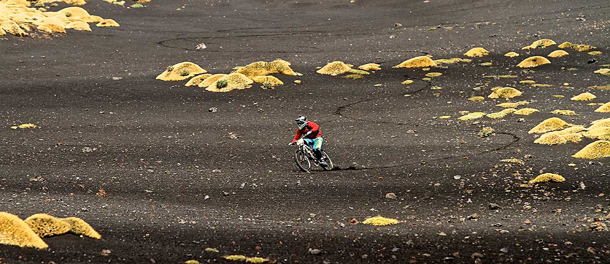 Scoperta da poco e già indelebile nel cuore e nella mente di ognuno di noi… Tra arancini di riso, cannoli e quella superficie nera che ti lascia senza parole, a voi il report fotografico della nostra seconda tappa sull’Etna, un’esperienza indimenticabile! Paolo Binarelli che l’ha vissuta per la prima volta posta sulla sua pagina Facebook: “In genere odio i lunedì mattina. Ma quella di oggi è stata la mattina di un lunedì diverso dagli altri. Svegliato dal solito schiaffo di luce sulla faccia ho raccolto la piccola pietra nera che avevo lasciato sul comodino ieri sera. Una piccola pietra nera, insignificante nelle mani di chiunque altro, ma non nelle mie… vengo scosso da un fremito mentre accarezzo il lapillo, un frammento di roccia che il vulcano ha trasformato in pomice dopo averlo strappato dalle viscere della terra. Sento la pioggia, il vento che mi ghiaccia le mani, i piedi che affondano nella cenere mentre spingo la bicicletta. Fatica e, cazzo, c’è la nebbia! Siamo vicini, ecco le voci dei miei amici, andiamo avanti! Poi ci lanciamo giù appena il cielo si apre. Goduria allo stato puro. Le nostre ruote fendono la superficie di quel mare nero, immenso… inseguo le scie di polvere di una discesa che sembra non avere mai fine. Frammenti di pomice e altri detriti mi investono a ogni curva, li sento in bocca, sotto la maglia, dentro le scarpe. Dappertutto! Goduria assoluta. Ci fermiamo, gli sguardi si incrociano… si fa fatica a parlare, ma cazzo se siamo contenti, felici, appagati! E ora abbiamo solo voglia di una birra ghiacciata… la assaporo mentre accarezzo il mio lapillo. L’orgasmo della Gravity School Etna Experience in una piccola pietra. Tardissimo! Lo lascio sul comodino… drifto al bagno, devo andare!” Comunque te la devi guadagnare… Per calare (terminologia sicula che sta a indicare la discesa) dall’Etna si prendono gli impianti di risalita e poi si cammina per andare a trovare le linee migliori. A meno che non vogliate farvi la squallida e affollata gippabile sotto gli impianti, lassù ci devi andare con una guida o tramite la Gravity School che pensa a tutta la trasferta Sveglia all’alba… …aereo, caffè, hotel, caffè, monta le bici, sali sull’Etna, spingi la bici: prima di scendere Cali e Michele si prendono dieci minuti di relax – meritati Re-impara a guidare Sei da solo a scendere, i tuoi amici sono partiti in ogni direzione per lasciarti, o prendersi, la sacralità del momento. Cerchi di capire come impostare le curve e come gestire i freni, hai la pelle d’oca e vorresti urlare a più non posso. Lo farai a fine discesa guardando in faccia i tuoi amici Freeride is not dead Michele, al centro, studia e analizza il comportamento da adottare su questo nuovo terreno, sulla destra Luca e Lucky “se la tirano” sfoggiando una certa confidenza essendo la seconda esperienza. La prossima volta ci sarà bagarre… Solo poster E’ stato difficile fare una selezione delle foto, avendole vissute in prima persona ci sono sembrate tutte da incorniciare A 60 kmh sotto il diluvio Nessuna foto rende giustizia alla pendenza, ma se si mollano i freni si possono raggiungere velocità importanti, soprattutto se la pioggia compatta la cenere vulcanica rendendo il terreno ancora più veloce. Con la nebbia sei fottuto Meglio il diluvio universale che la nebbia… Sull’Etna per ora è sempre andata bene, siamo scesi con le dita ghiacciate dopo un temporale a 2.600 m, con il sole, con il vento, ma quando ti trovi nel nebbione di Fantozzi armati di pazienza. Quell’attesa verrà ripagata… La pazienza è la virtù dei forti e qui non sono ammessi sgarri o ansia. Abbiamo vissuto dei momenti in cui non riuscivamo a vedere la nostra ruota davanti Learn quick Simone è alla sua decima raidata in mtb e alla sua prima volta sull’Etna: se ce l’hai dentro non ti ferma nessuno Vale tutto Paolo Binarelli, per noi “il Binaz”, mentre cerca di sfuggire ai frequenti sottosterzi di questo terreno Alla ricerca del vergine Luca trova un canale illibato e non ci pensa due volte, Lucky lo segue poco dopo incrociando le “S” La tecnica Gira la testa, apri il gomito e spingi con il ginocchio sul telaio, altrimenti non la tieni giù nelle driftate Action cam Qualunque essa sia, è d’obbligo per farti risalire la scimmia quando sei rinchiuso in ufficio Ganci La scorsa volta per caricare la bici si doveva smontare la ruota davanti, adesso ci sono dei comodi ganci Quando è secco Se non piove da tempo la sensazione è diversa da quando è bagnato, il terreno tiene molto meno e chi ti precede alza una scia bellissima da vedere Guarda l’orizzonte Mia mamma non è rimasta sorpresa da questa foto, poi le ho fatto notare la linea dell’orizzonte e mi ha detto: “ma voi siete pazzi!” La firma che la pioggia cancellerà Sei galvanizzato di ciò che stai vivendo ma se ti guardi indietro ti spiace lasciare le tue tracce. No problem, il vento e la pioggia farà un “delete all” Non solo nero Dipende da dove stai guardando, ma se alzi lo sguardo laggiù c’è Catania in tutto il suo splendore Trova i tuoi confini Se scendi piano puoi spaziare dove ti pare, se molli i freni sei obbligato a curvare nei posti più impensabili. A manetta devi calcolare le traiettorie più rapidamente e non sempre ti riesce la cosa giusta Poi tutto cambia Se in cima è tutto nero, mano a mano che scendi la natura cambia e ti regala fotografie uniche L’Etna crea dipendenza E’ stato Piero, che dopo aver saggiato quel mare nero il venerdì, ha proposto il sabato sera un cambio di programma della Gravity School, che si stava svolgendo su tutt’altro terreno e con tutt’altra modalità. Si è messo ai voti, tutti hanno accettato e la domenica mattina al posto di fare i bicchierini (esercizio obbligatorio in tutte le Gravity School) la nostra direzione puntava ben più in alto. Grazie Piero… a nome di tutti! We were there L’immancabile adesivo che marca un territorio, questa volt